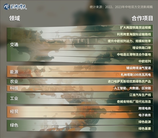 這兩年間,中哈提到的合作項(xiàng)目,涉及交通、能源、工業(yè)、農(nóng)業(yè)、經(jīng)貿(mào)、科技等多個(gè)領(lǐng)域,其中出現(xiàn)頻次最多的,是交通——從“中歐班列”、“增設(shè)鐵路口岸”,再到“中哈連云港物流合作基地”。