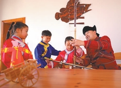 哈拉新村村民在教當(dāng)?shù)睾⒆友葑鄠鹘y(tǒng)樂(lè)器。齊齊哈爾大學(xué)孟加拉國(guó)籍留學(xué)生 衣睿實(shí)攝“在哈拉新村,我看到四弦琴造型的村口大門(mén)、魚(yú)叉狀的路燈,還有整整齊齊的‘介字房’……這里獨(dú)特的民族文化、濃郁的鄉(xiāng)土風(fēng)情,給我留下了深刻印象。當(dāng)?shù)丶缺A魝鹘y(tǒng)的達(dá)斡爾族人文特征,又開(kāi)發(fā)文化體驗(yàn)館、民族特色美食等現(xiàn)代旅游資源,重視文化保護(hù)和傳承的做法值得借鑒?!?/p>
