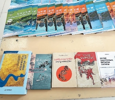 在孔子學(xué)院文化活動(dòng)室桌面上,擺著幾本用哈薩克語翻譯的中國書籍,《邊城》《駱駝祥子》《長春真人西游記》《陰山汪古》等等。