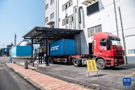 10月17日,在中國(guó)石化集團(tuán)重慶川維化工有限公司,工作人員在將以乙炔為原料生產(chǎn)的化工產(chǎn)品進(jìn)行打包裝車。