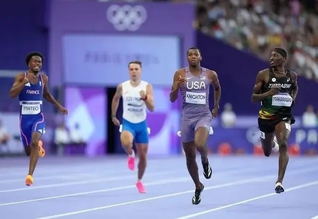 2024年8月5日,美國選手奈頓(右二)在比賽中。當(dāng)日,巴黎奧運會田徑男子200米第一輪比賽在法蘭西體育場舉行。新華社記者呂小煒 攝