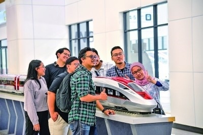 老撾《萬象時(shí)報(bào)》記者索薩坤·萬喬在參觀廣元千佛崖時(shí),拍攝飛馳而過的動(dòng)車組列車。老撾國家通訊社記者 汶娜萊·楠坎娜攝