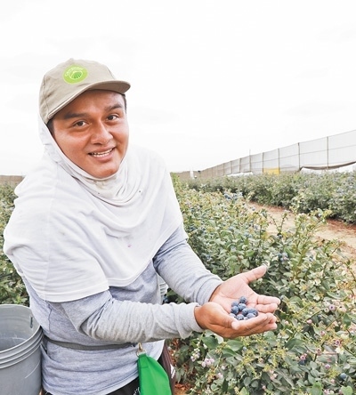 在秘魯特魯希略市一家農(nóng)場里,一名采摘工人在展示他剛摘下的藍(lán)莓。本報(bào)記者 顏 歡攝