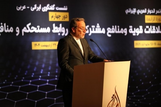 5月10日,伊朗外長阿拉格齊在卡塔爾多哈出席第四屆阿拉伯-伊朗對(duì)話會(huì)議時(shí)講話。新華社發(fā)(主辦方供圖)