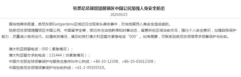 新華社悉尼5月23日電 中國駐悉尼總領(lǐng)館23日連續(xù)發(fā)布兩條提醒,提醒領(lǐng)區(qū)中國公民加強(qiáng)人身安全防范。