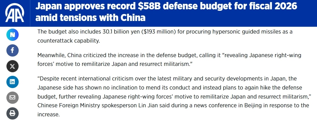 土耳其安納多盧通訊社26日的報(bào)道,列舉了日本創(chuàng)紀(jì)錄防衛(wèi)預(yù)算中涉及的方面,例如無(wú)人機(jī)、高超音速導(dǎo)彈和航空宇宙自衛(wèi)隊(duì)等。同時(shí),報(bào)道引述中方的批評(píng)稱(chēng),“近期國(guó)際社會(huì)對(duì)日本的軍事安全動(dòng)向,批評(píng)聲音不斷,日方不但沒(méi)有反省收斂,反而計(jì)劃再次大幅增加防衛(wèi)預(yù)算,更加暴露出日本右翼勢(shì)力推動(dòng)日本‘再軍事化’、企圖讓軍國(guó)主義死灰復(fù)燃的險(xiǎn)惡用心?!?/p>