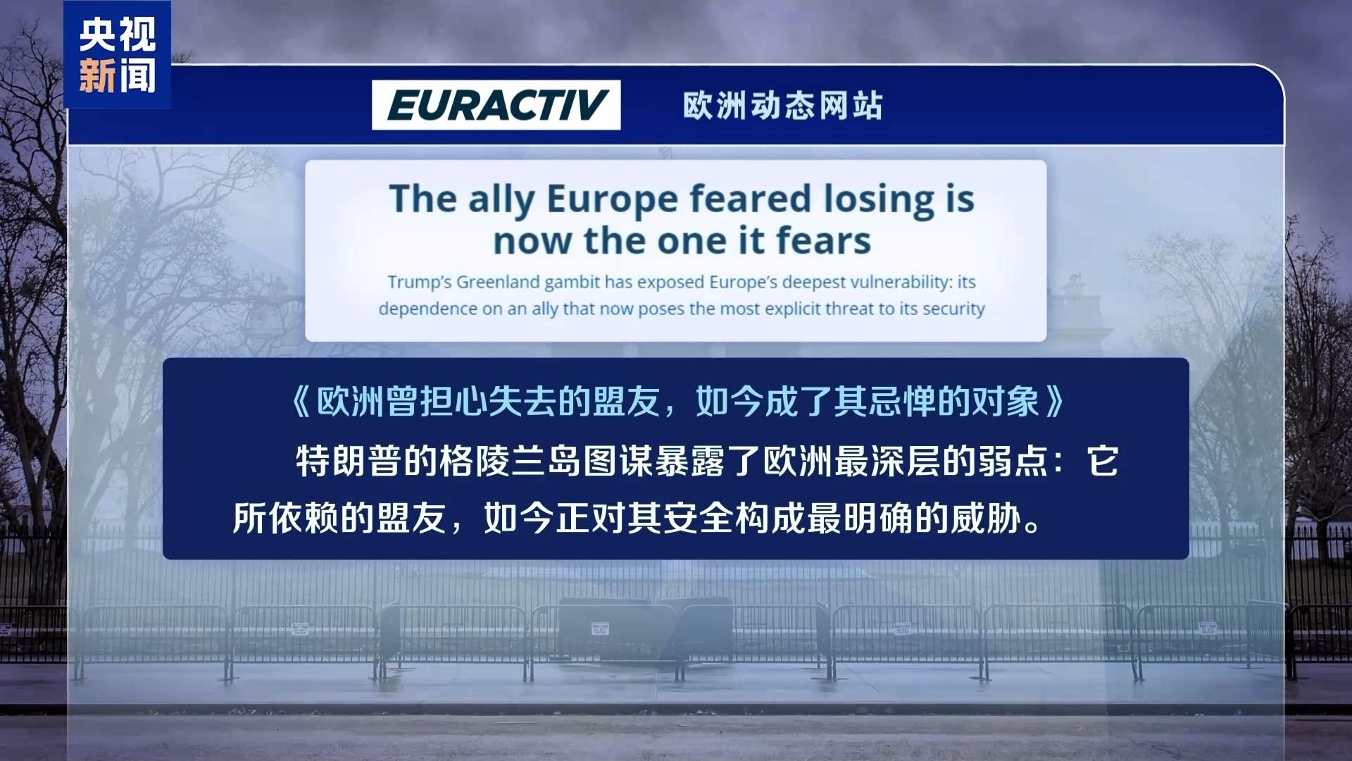 歐洲動(dòng)態(tài)網(wǎng)站6日以《歐洲曾擔(dān)心失去的盟友,如今成了其忌憚的對(duì)象》為題評(píng)論說(shuō),“特朗普的格陵蘭島圖謀暴露了歐洲最深層的弱點(diǎn):它所依賴(lài)的盟友,如今正對(duì)其安全構(gòu)成最明確的威脅?!蔽恼逻€提醒說(shuō),我們正進(jìn)入一個(gè)“強(qiáng)權(quán)即公理”的新世界——而歐洲人對(duì)此毫無(wú)準(zhǔn)備?;蛟S,格陵蘭島可能帶來(lái)的羞辱,將促使歐洲人反思這一現(xiàn)狀,并最終采取行動(dòng)改變局面。