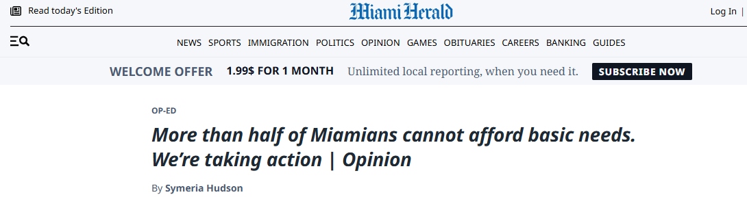 文章表示,在邁阿密,現(xiàn)實令人清醒:戴德縣超過五十萬個家庭難以負擔住房、食品、醫(yī)療、托兒、交通和技術(shù)等必需品和服務。家庭收入與實際生活成本之間的差距持續(xù)擴大。西默里亞·哈德森在文中強調(diào),這些挑戰(zhàn)并非抽象概念。當家庭被迫在支付房租和喂養(yǎng)孩子之間作出選擇時,這并非個人失敗,而是系統(tǒng)性問題。這需要企業(yè)領導者、政策制定者、教育者、醫(yī)療系統(tǒng)、非營利組織和普通公民共同努力。
