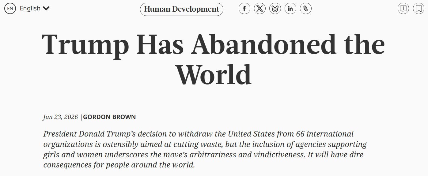 布朗在文章中指出,美國(guó)宣布退出的66個(gè)國(guó)際組織中包括31個(gè)聯(lián)合國(guó)下屬機(jī)構(gòu)和35個(gè)非聯(lián)合國(guó)機(jī)構(gòu)。他批評(píng)說(shuō),從未有任何一國(guó)領(lǐng)導(dǎo)人,能在短短一個(gè)月內(nèi)如此全面地切斷本國(guó)與國(guó)際社會(huì)的聯(lián)系。