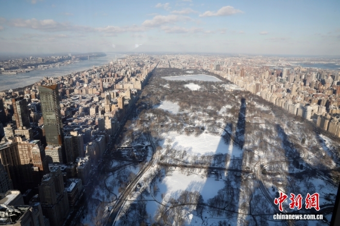 當(dāng)?shù)貢r間1月29日,從100層高樓俯瞰冰雪封凍的紐約市,中央公園白雪皚皚,遠處的哈德遜河布滿浮冰。中新社記者 廖攀 攝