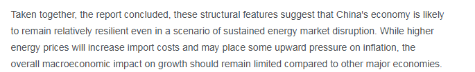 報告總結(jié)稱,即便能源市場持續(xù)動蕩,中國受沖擊程度也將明顯輕于其他主要經(jīng)濟體。雖然能源價格上漲可能推升進口成本并產(chǎn)生一定通脹壓力,但對整體經(jīng)濟增長的宏觀影響將保持可控。