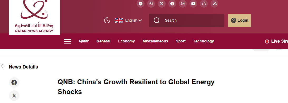 卡塔爾通訊社28日援引卡塔爾國家銀行出爐的最新報告指出,盡管地緣政治緊張局勢加劇與全球能源市場波動,中國經(jīng)濟仍展現(xiàn)出顯著抗風險能力。報告認為,中國能源結(jié)構(gòu)多元化、石油依賴度較低及戰(zhàn)略儲備雄厚等結(jié)構(gòu)性優(yōu)勢,能有效緩沖能源價格上漲沖擊。