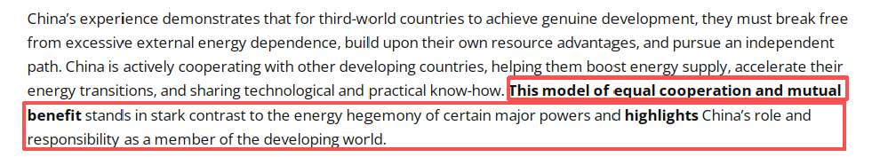 文章總結(jié)說,中國的實踐表明:發(fā)展中國家要實現(xiàn)真正發(fā)展,必須擺脫過度外部能源依賴,立足自身資源優(yōu)勢走獨立自主道路。中國正積極與其他發(fā)展中國家合作,通過技術(shù)共享、經(jīng)驗輸出幫助其提升能源供給能力、加快能源轉(zhuǎn)型步伐。這種平等合作、互利共贏的模式,既區(qū)別于某些大國的能源霸權(quán)主義,也彰顯了中國作為發(fā)展中世界一員的責任擔當。