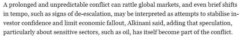 一名研究中東地區(qū)的金融分析師澤頓·阿爾基納尼(Zeidon Alkinani)告訴半島電視臺,曠日持久且難以預(yù)測的沖突會動搖全球金融市場的信心,即使是短暫的節(jié)奏變化,例如局勢緩和的跡象,也可能被解讀為試圖穩(wěn)定投資者信心和限制經(jīng)濟損失。阿爾基納尼強調(diào),“投機行為,特別是對石油等敏感行業(yè)的投機行為,本身也已成為沖突的一部分?!?/p>