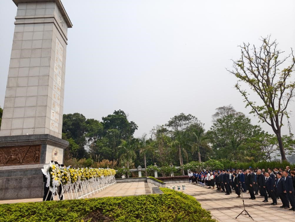 祭掃儀式莊嚴(yán)肅穆。中老人士敬獻(xiàn)花圈并鞠躬默哀,瞻仰紀(jì)念碑和烈士墓,向革命先輩表達(dá)崇高敬意。