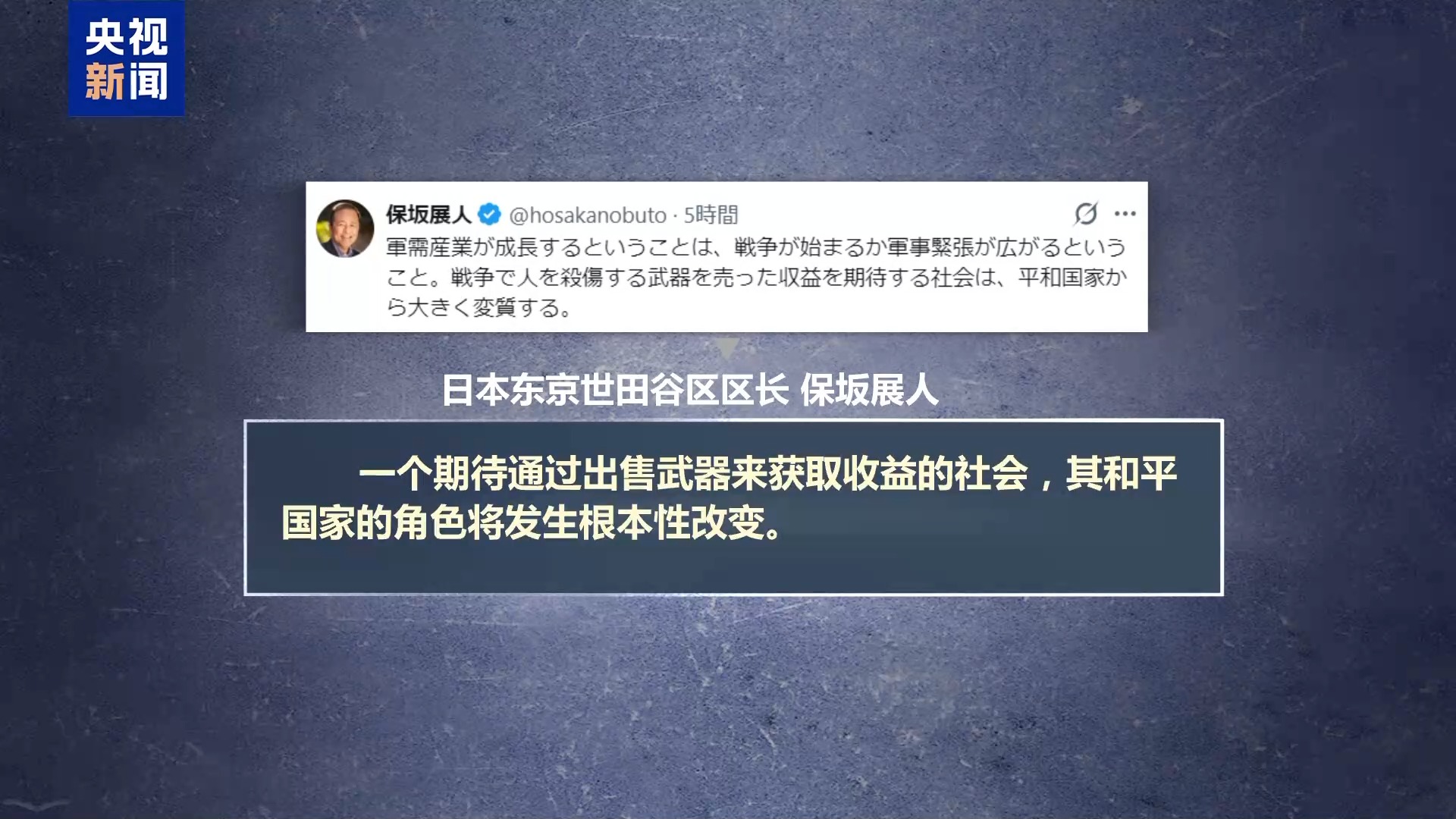 日本東京世田谷區(qū)區(qū)長(zhǎng)保坂展人在社交媒體上表示,一個(gè)期待通過(guò)出售武器來(lái)獲取收益的社會(huì),其和平國(guó)家的角色將發(fā)生根本性改變。