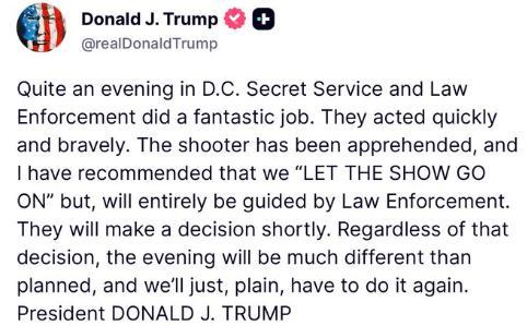 特朗普隨后在社交媒體上說,一名涉事槍手已被拘捕,他“已建議‘活動照常進(jìn)行’,但最終將完全遵從執(zhí)法部門的安排……無論最終決定如何,今晚的活動安排都將和原定計劃有很大不同。我們后續(xù)需要重新舉辦這場活動”。