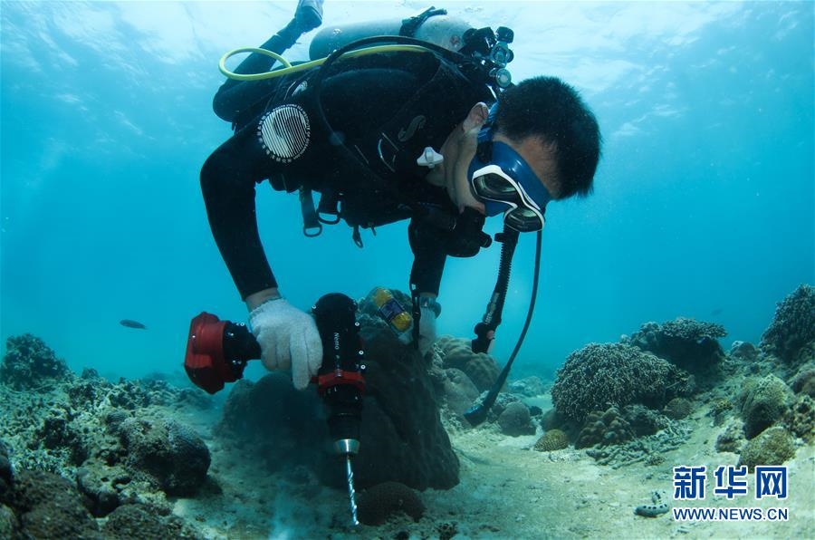 在海南三亞蜈支洲島海域,張?jiān)£栐诤5足@孔,以便安裝移植釘固定珊瑚(4月28日攝)。新華社記者楊冠宇攝