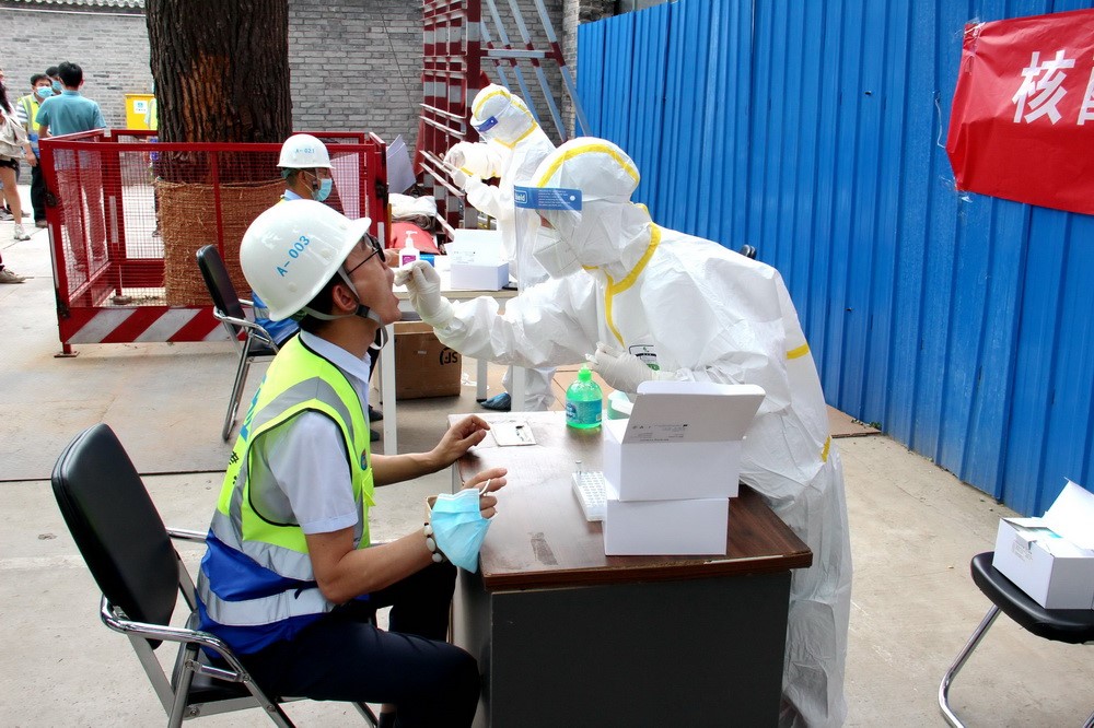6月15日至17日,中建三局北京公司在京1042名職工做完核酸檢測,同時公司邀請專業(yè)機構為在建項目的上萬名勞務工人、安保及物業(yè)管理人員提供上門核酸檢測。新華社發(fā)(柯玉乾攝)