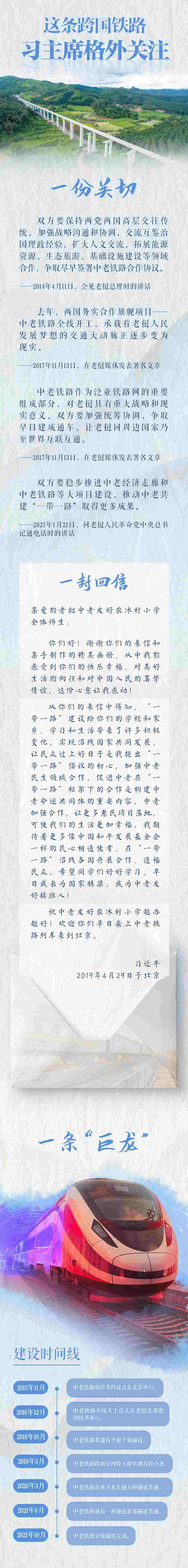 中老鐵路北起中國昆明,南至老撾萬象,全長1000多公里。這條承載著友誼、科技、綠色、開放的跨國鐵路,是我國“一帶一路”倡議與老撾“變陸鎖國為陸聯(lián)國”戰(zhàn)略對接的重要項目,也是“一帶一路”倡議提出以后,首條以中方為主投資建設(shè)、全線采用中國技術(shù)標(biāo)準(zhǔn)、使用中國設(shè)備并與中國鐵路網(wǎng)直接聯(lián)通的跨國鐵路。對于這條鐵路,習(xí)近平主席一直格外關(guān)注。他與老撾高層多次就中老鐵路建設(shè)進(jìn)行深入溝通,并給老撾萬象中老友好農(nóng)冰村小學(xué)師生回信,歡迎他們早日乘上中老鐵路列車來到北京。
