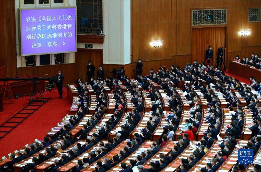 3月11日,十三屆全國人大四次會議表決通過《全國人民代表大會關(guān)于完善香港特別行政區(qū)選舉制度的決定》。這是繼制定實(shí)施香港國安法后,中央依法治港的又一重大舉措,是完善“一國兩制”制度體系、落實(shí)中央對香港全面管治權(quán)的具體體現(xiàn),為全面落實(shí)“愛國者治港”原則提供了更加堅(jiān)實(shí)的制度保障。3月30日,十三屆全國人大常委會第二十七次會議通過了新修訂的香港基本法附件一和附件二。隨后,香港特別行政區(qū)完成本地立法。新選舉制度為推進(jìn)香港民主穩(wěn)步發(fā)展、實(shí)現(xiàn)良政善治,促進(jìn)“一國兩制”實(shí)踐行穩(wěn)致遠(yuǎn)打下堅(jiān)實(shí)基礎(chǔ)。