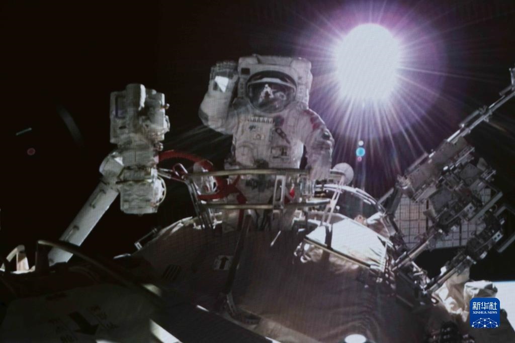 這是2021年11月7日在北京航天飛行控制中心拍攝的神舟十三號航天員翟志剛出艙畫面。新華社發(fā)(郭中正 攝)
