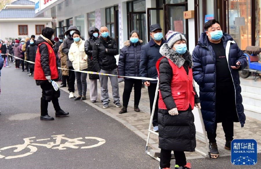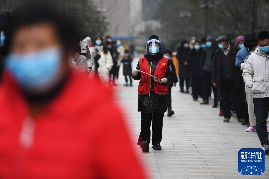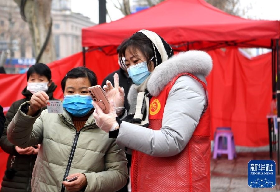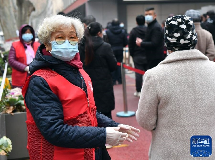 1月7日,在鄭州市經(jīng)八路辦事處一處檢測(cè)點(diǎn),75歲的志愿者耿小娣(左)在引導(dǎo)市民排隊(duì)。新華社記者李嘉南攝