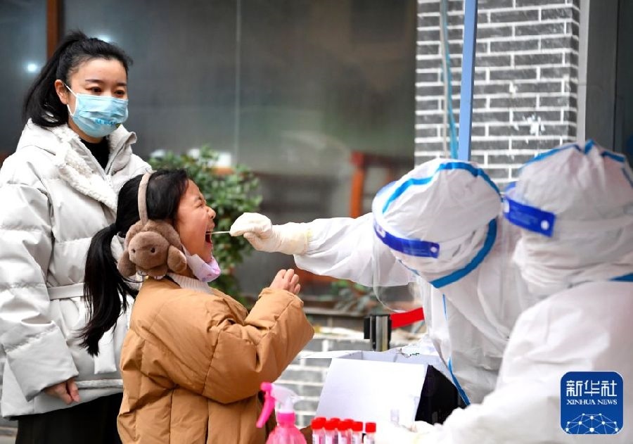 1月8日,在鄭州市金水區(qū)花園路街道辦事處一社區(qū)核酸檢測(cè)點(diǎn),醫(yī)務(wù)人員為小朋友進(jìn)行核酸檢測(cè)取樣。新華社記者郝源攝