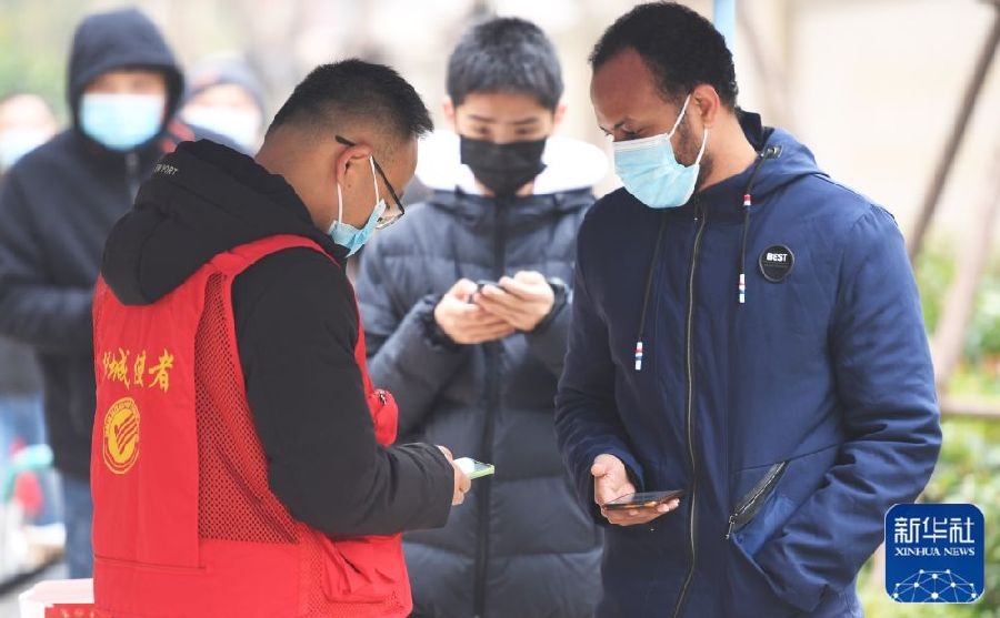 1月10日,在鄭州市高新區(qū)楓楊辦事處譽(yù)園核酸檢測(cè)點(diǎn),志愿者幫助外籍人員掃碼登記。新華社記者張浩然攝