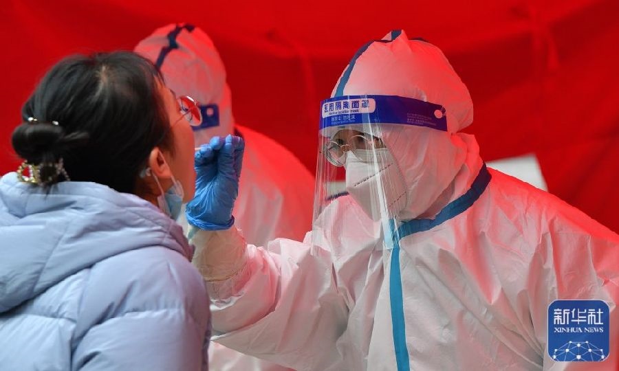 1月8日,在鄭州市高新區(qū)楓楊辦事處譽(yù)園核酸檢測(cè)點(diǎn),醫(yī)務(wù)人員為市民進(jìn)行核酸檢測(cè)取樣。新華社記者張浩然攝