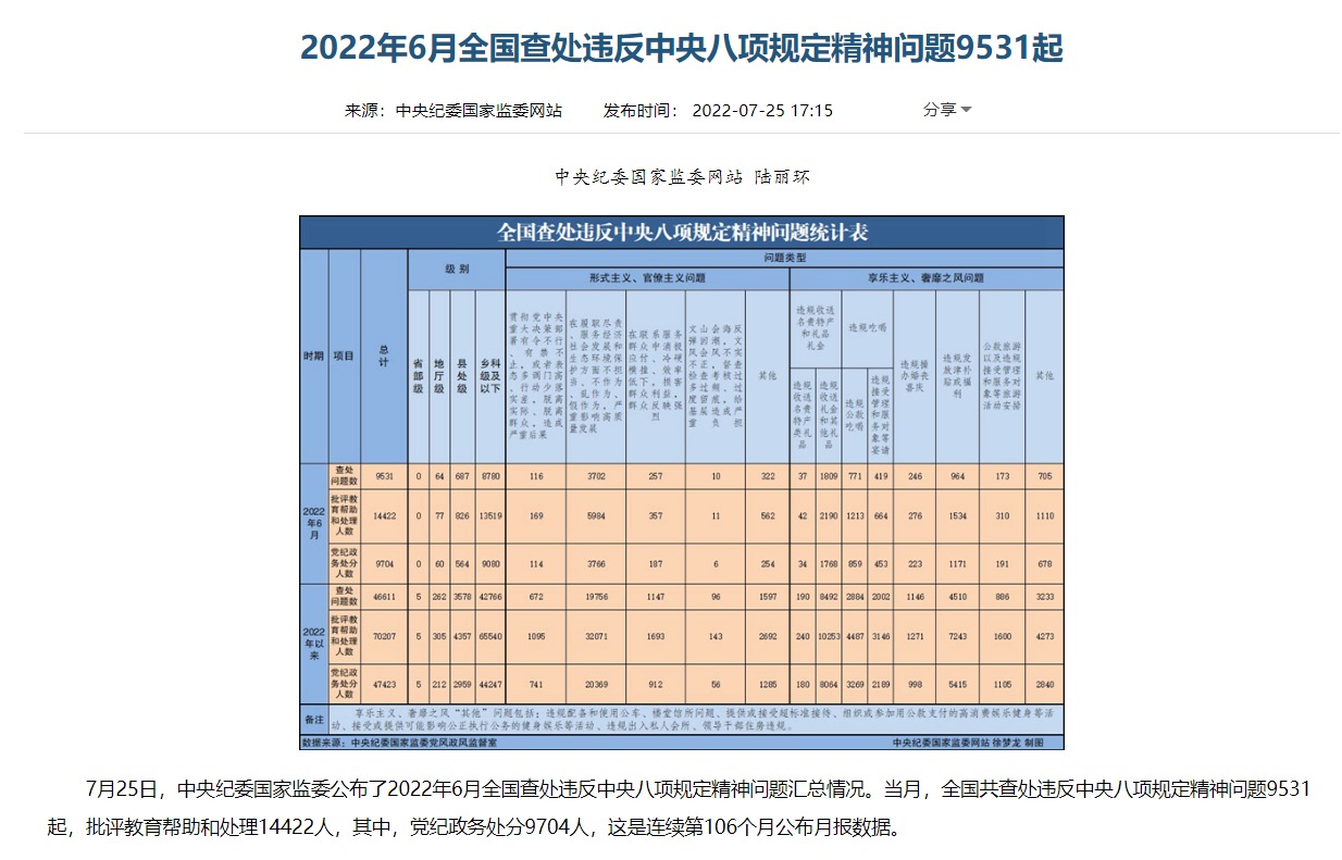 從公布的月報(bào)數(shù)據(jù)看,當(dāng)月(6月),全國共查處違反中央八項(xiàng)規(guī)定精神問題9531起,批評教育幫助和處理14422人,其中,黨紀(jì)政務(wù)處分9704人。