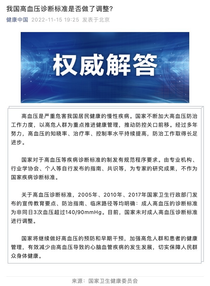 關(guān)于高血壓診斷標準,2005年、2010年、2017年國家衛(wèi)生行政部門發(fā)布的宣傳教育要點、防治指南、臨床路徑等均明確:成人高血壓的診斷標準為非同日3次血壓超過140/90mmHg。目前,國家未對成人高血壓診斷標準進行調(diào)整。