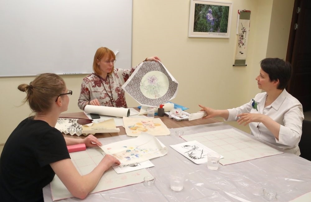 白俄羅斯藝術(shù)愛好者馬爾季涅夫斯卡婭(中)在明斯克的白俄羅斯國立大學(xué)孔子學(xué)院教授中國繪畫。