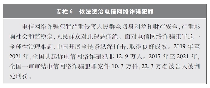 加大網(wǎng)絡(luò)犯罪懲治力度。隨著互聯(lián)網(wǎng)技術(shù)的快速發(fā)展,傳統(tǒng)犯罪加速向以互聯(lián)網(wǎng)為媒介的非接觸式犯罪轉(zhuǎn)變,電信網(wǎng)絡(luò)詐騙、網(wǎng)絡(luò)賭博、網(wǎng)絡(luò)淫穢色情等涉網(wǎng)違法犯罪多發(fā)。中國(guó)依法辦理新型網(wǎng)絡(luò)犯罪案件。連續(xù)多年開展“凈網(wǎng)行動(dòng)”,嚴(yán)厲打擊群眾反映強(qiáng)烈的黑客攻擊破壞、侵犯公民個(gè)人信息等違法犯罪活動(dòng)。持續(xù)推進(jìn)“云劍”“斷卡”“斷流”“拔釘”等專項(xiàng)行動(dòng),打擊套路貸、校園貸、“以房養(yǎng)老”、“投資養(yǎng)老”等電信網(wǎng)絡(luò)詐騙犯罪,依法懲處為電信網(wǎng)絡(luò)詐騙犯罪團(tuán)伙提供互聯(lián)網(wǎng)接入、域名注冊(cè)、服務(wù)器托管、移動(dòng)互聯(lián)網(wǎng)應(yīng)用程序制作開發(fā)、網(wǎng)絡(luò)支付、引流推廣等服務(wù)支撐的黑灰產(chǎn)業(yè)。完善國(guó)家反詐大數(shù)據(jù)平臺(tái)和反詐移動(dòng)互聯(lián)網(wǎng)應(yīng)用程序,建設(shè)國(guó)家涉詐黑樣本庫(kù),完善快速止付凍結(jié)機(jī)制、涉詐資金返還機(jī)制。堅(jiān)決打擊網(wǎng)絡(luò)賭博犯罪行為,從嚴(yán)治理網(wǎng)絡(luò)淫穢色情。網(wǎng)絡(luò)犯罪治理工作取得明顯成效,人民群眾安全感有效提升,社會(huì)更加和諧穩(wěn)定。