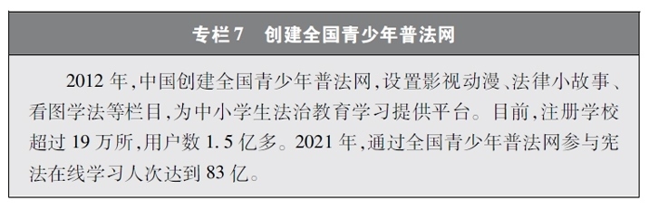 加強(qiáng)青少年網(wǎng)絡(luò)法治宣傳教育。青少年是祖國(guó)的未來(lái)、民族的希望。青少年網(wǎng)民在中國(guó)網(wǎng)民中的占比逐步增長(zhǎng)。作為互聯(lián)網(wǎng)的“原住民”,青少年是網(wǎng)上學(xué)習(xí)、交流、生活最活躍的參與者、實(shí)踐者,其合法權(quán)益也更易受到網(wǎng)絡(luò)違法活動(dòng)的侵害。中國(guó)從保護(hù)青少年網(wǎng)絡(luò)權(quán)益,促進(jìn)青少年健康成長(zhǎng)、全面發(fā)展出發(fā),遵循青少年身心發(fā)展規(guī)律,貼近青少年學(xué)習(xí)生活實(shí)際,聚焦網(wǎng)絡(luò)沉迷、網(wǎng)絡(luò)欺凌、網(wǎng)絡(luò)淫穢色情信息等重點(diǎn)問(wèn)題,通過(guò)普法微綜藝、兒童普法話劇、網(wǎng)絡(luò)普法故事廣播、網(wǎng)絡(luò)普法云課堂、學(xué)法用法知識(shí)競(jìng)賽、法治副校長(zhǎng)進(jìn)校園、編寫網(wǎng)絡(luò)普法讀本等生動(dòng)活潑、豐富多彩的形式開展法治宣傳教育,逐步形成了政府、社會(huì)、學(xué)校、家庭相結(jié)合的法治宣傳教育格局,為提升青少年網(wǎng)民法治意識(shí)和網(wǎng)絡(luò)安全素養(yǎng)提供了全面保障。
