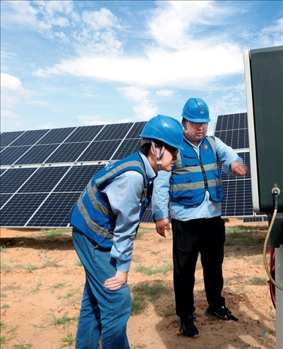 ▲ 國家電投五凌電力余丁光伏電站職工在檢修設(shè)備(2022年8月31日攝) 盧鷹攝