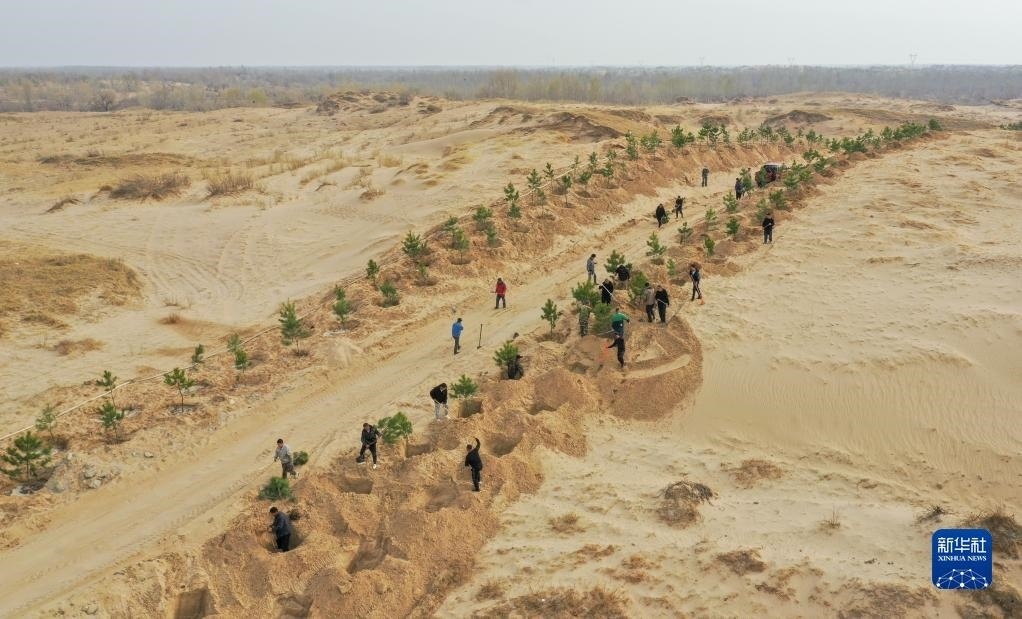 近日,在內(nèi)蒙古通遼市科爾沁左翼后旗,治沙工人忙著植樹(shù)造林,給科爾沁沙地披上“綠裝”。科爾沁沙地橫跨內(nèi)蒙古、吉林、遼寧三省區(qū),沙地面積7760萬(wàn)畝,在內(nèi)蒙古通遼市境內(nèi)占52.7%。近年來(lái),依托“三北”防護(hù)林、退耕還林、公益林保護(hù)等重點(diǎn)生態(tài)工程,內(nèi)蒙古通遼市不斷加大植樹(shù)造林、草原修復(fù)和生態(tài)保護(hù)力度,科爾沁沙地生態(tài)環(huán)境得到改善。   新華社記者 連振 攝