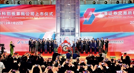 上海證券交易所舉行的科創(chuàng)板首批公司上市儀式現(xiàn)場(chǎng)(2019年7月22日攝) 方喆攝/本刊