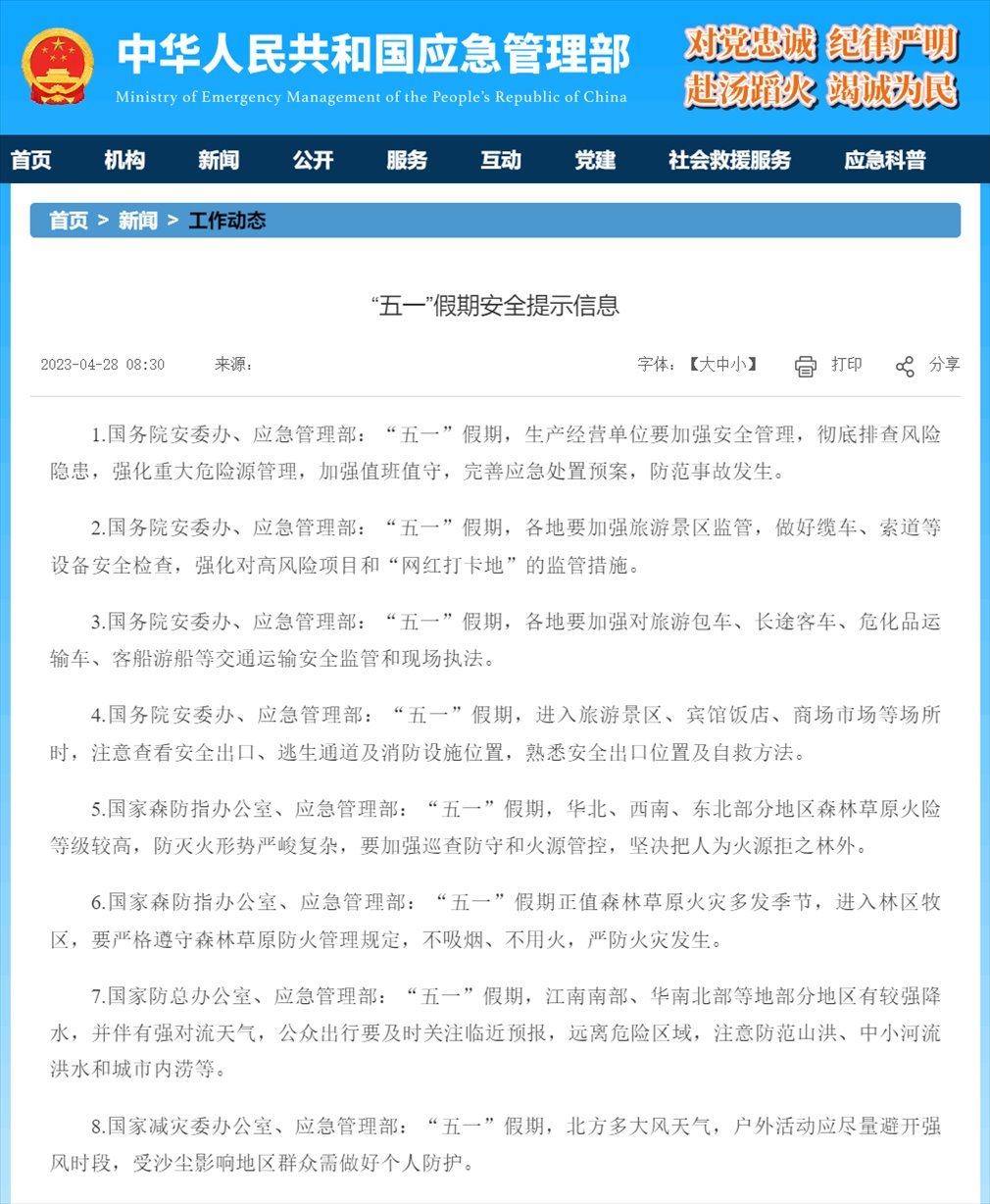 應(yīng)急管理部發(fā)布“五一”假期八大安全提示