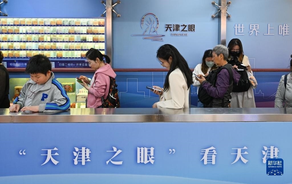 4月27日,游客在乘坐“天津之眼”摩天輪時觀看轎廂內(nèi)新設(shè)置的天屏播放的文旅宣傳視頻。