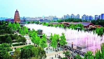 游人在陜西西安大雁塔北廣場(chǎng)觀看音樂噴泉表演。新華社發(fā)