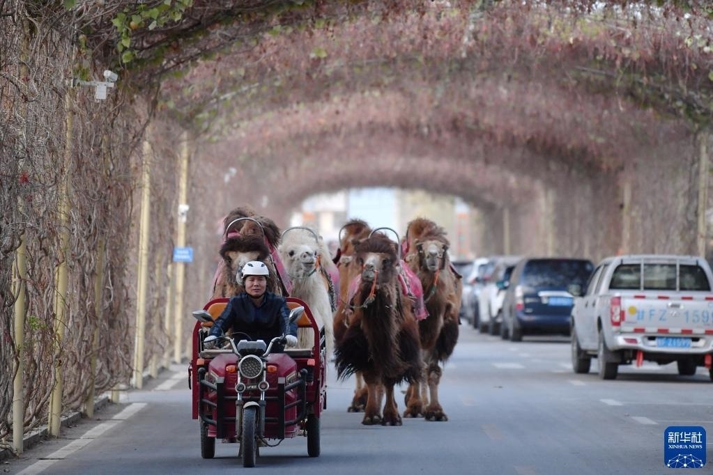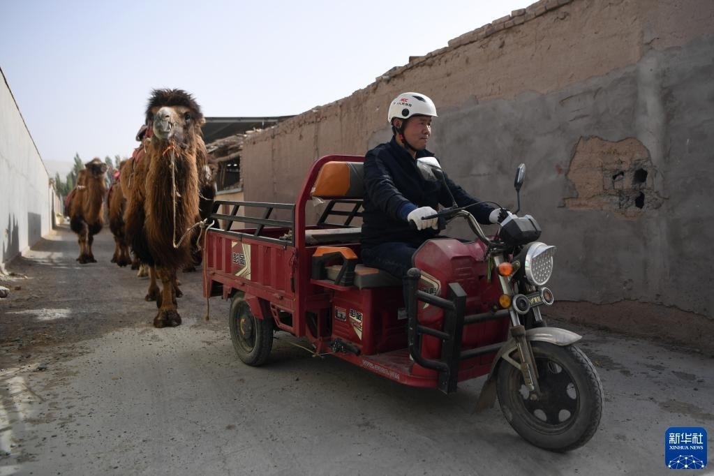 曹文華騎著三輪車帶著駱駝“下班”(4月24日攝)。
