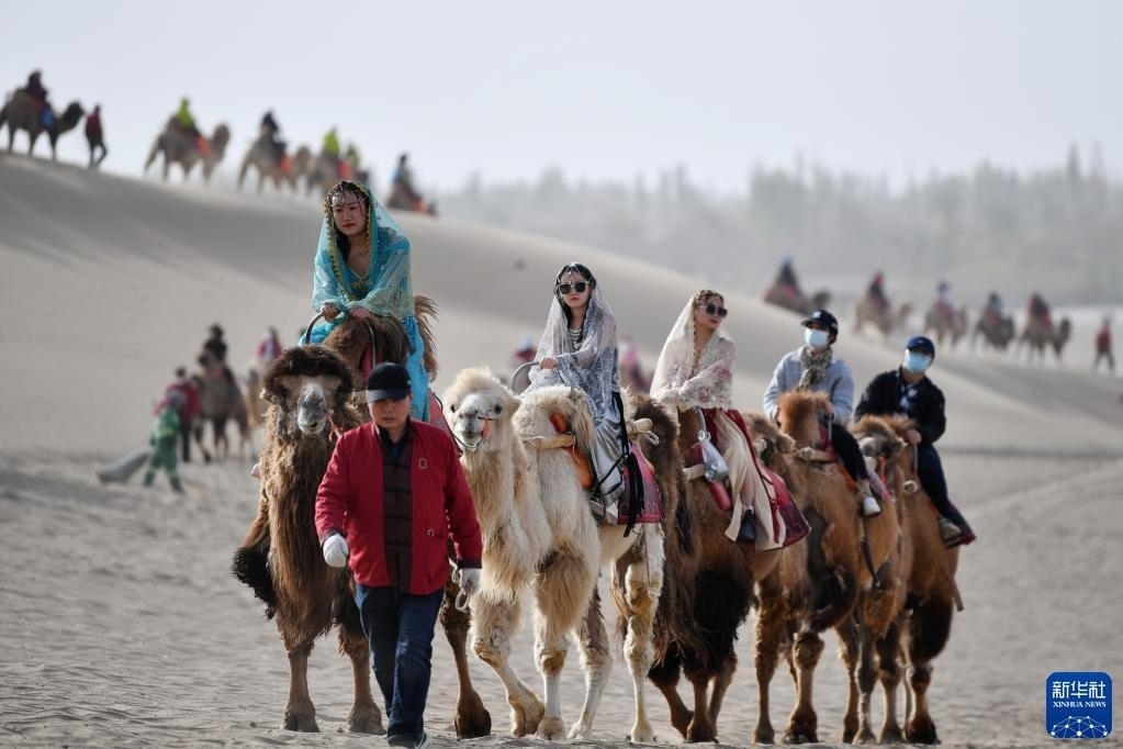 游客騎著駱駝在鳴沙山月牙泉景區(qū)游覽(4月29日攝)。