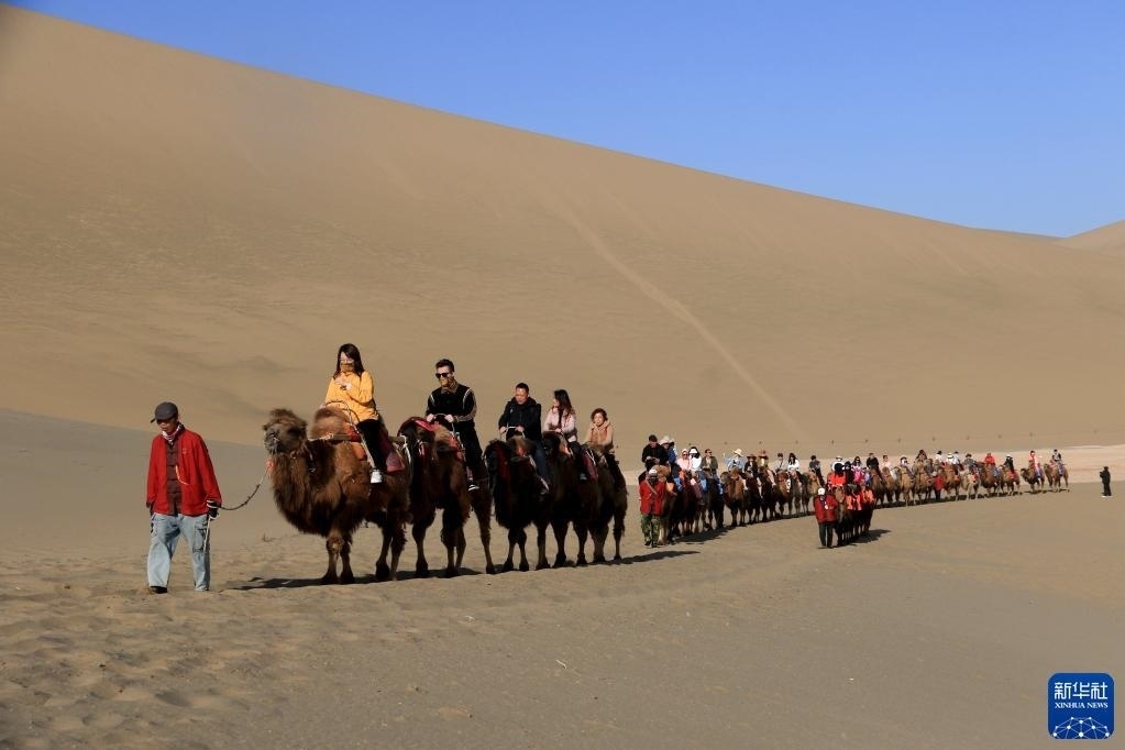 金色的鳴沙山上響起陣陣駝鈴聲,編號(hào)“414”的領(lǐng)頭駱駝和51歲的牽駝人曹文華一起帶領(lǐng)著駝隊(duì),馱著游客,朝連綿起伏的沙丘深處走去。