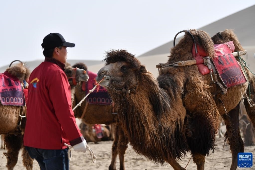 曹文華準(zhǔn)備牽駱駝前往鳴沙山月牙泉景區(qū)(4月24日攝)。