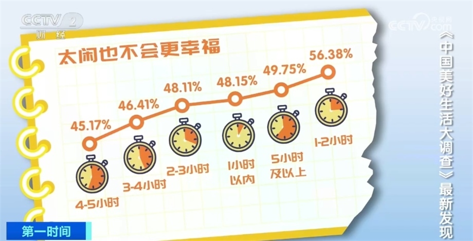 越忙碌的人,幸福感越低嗎?不一定。大調(diào)查發(fā)現(xiàn),休閑時間1—2小時的人群,幸福感最高,達到56.38%。休閑時間5小時以上人群中,感到幸福的比例只有49.75%。此后,除了沒有休閑時間人群外,隨著休閑時間的增加,感到幸福的人群比例是降低的??梢?,適當(dāng)?shù)拿β底屔畛錆M節(jié)奏感,幸福也來得更踏實。