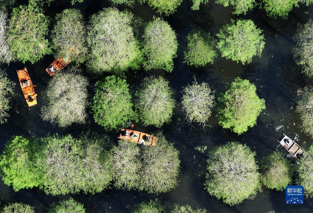 5月1日,游客在江蘇省揚州市淥洋湖濕地公園的水上森林乘船游覽(無人機照片)。