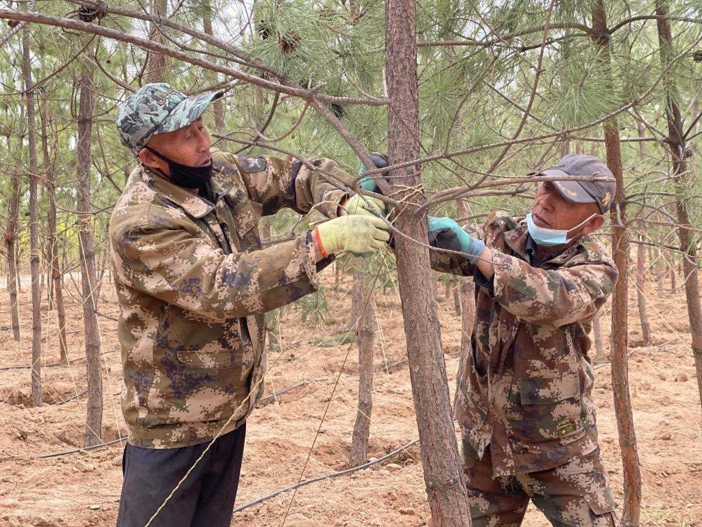 記者看到,為應(yīng)對當(dāng)?shù)卮杭敬箫L(fēng)天氣,苗木工人在每棵樹四周打下木樁,再用繩子將樹苗與樹樁捆綁,進(jìn)一步固定苗木,以提高成活率。