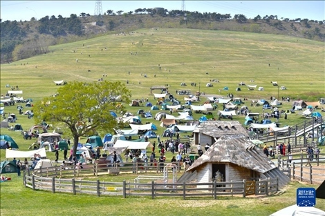 5月1日,游客在遼寧省大連市三寰牧場景區(qū)搭帳篷露營。