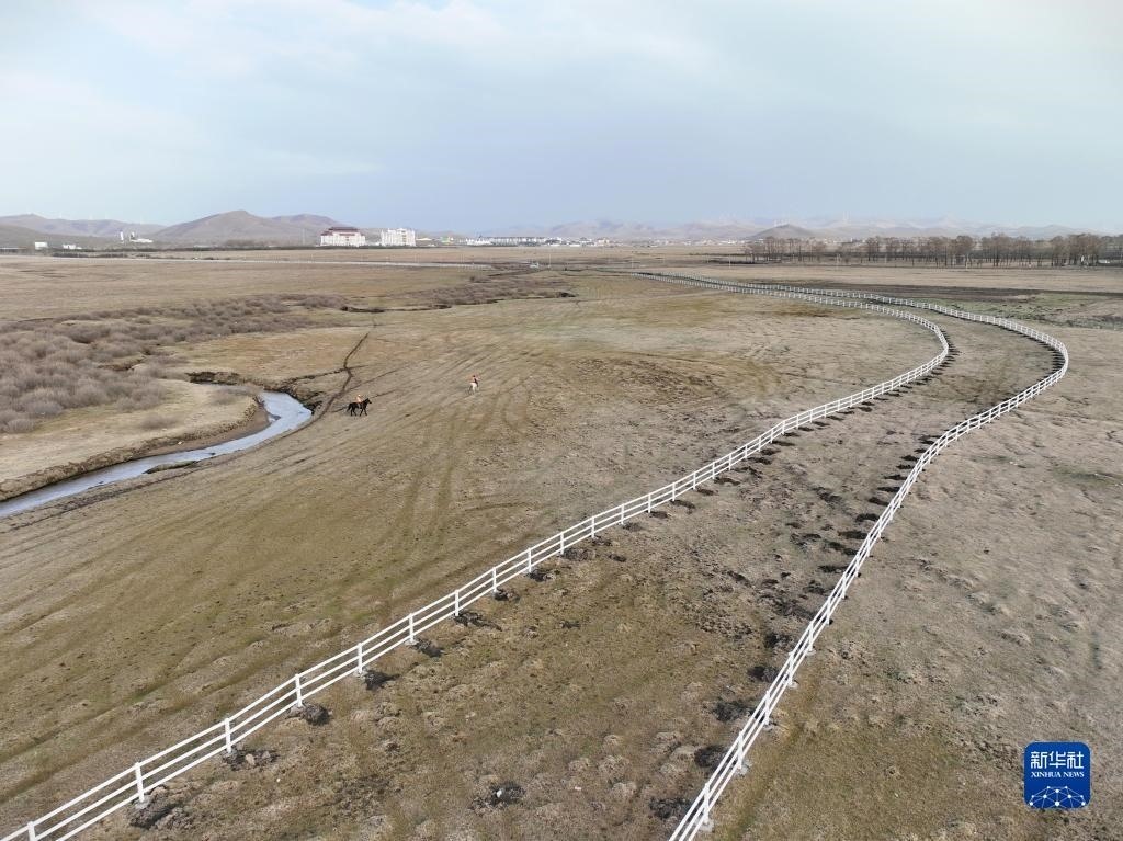 5月2日,河北省承德市豐寧滿族自治縣大灘鎮(zhèn)扎拉營村的護林員在海留圖國家濕地公園巡邏(無人機照片)。